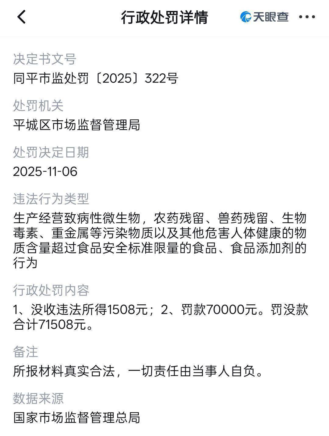 记者在该酒店社交账号查到,其认证信息为大同悦逸酒店有限责任公司。天眼查显示,该公司于2025年11月6日有一条行政处罚信息,违法行为类型为:生产经营致病性微生物,农药残留、兽药残留、生物毒素、重金属等污染物质以及其他危害人体健康的物质含量超过食品安全标准限量的食品、食品添加剂的行为。行政处罚内容为:没收违法所得1508元;罚款70000元。罚没款合计71508元。